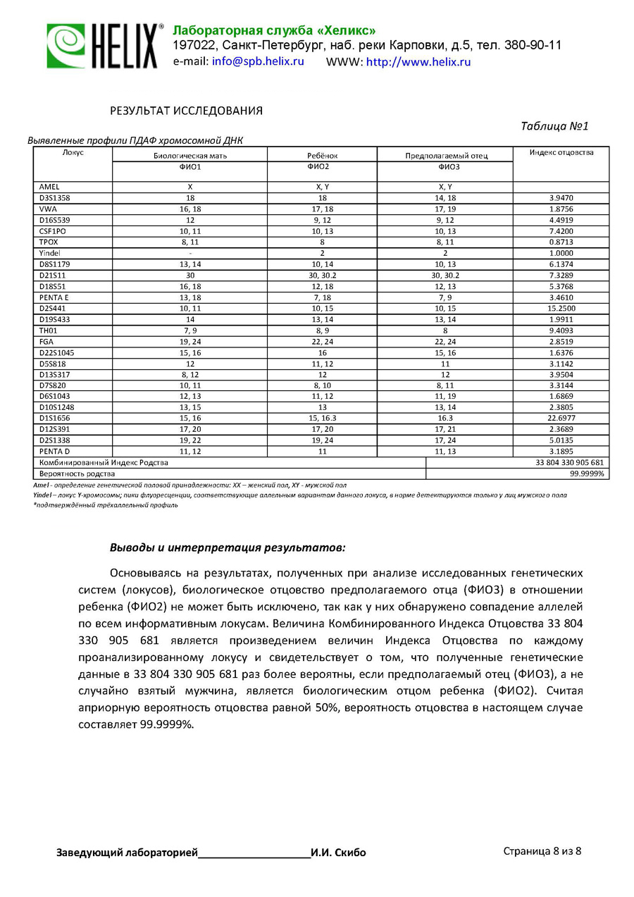 Вероятность при исключении отцовства/материнства составляет 100 %. Вывод об исключении отцовства/материнства делается, если в генотипах ребенка и предполагаемого отца/матери отсутствуют совпадающие аллели даже по отдельным локусам.